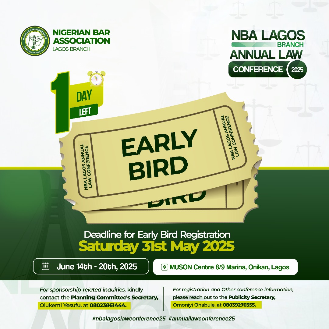 The countdown has begun as only 1 day remain for early bird registration for the 2025 Annual Law Conference of the Nigerian Bar Association (NBA), Lagos Branch.