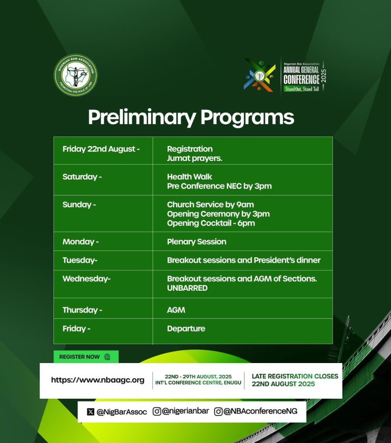 The countdown to the Nigerian Bar Association Annual General Conference (NBA-AGC) 2025 is in full swing, and the excitement is building! Delegates can now mark their calendars with the just-released Preliminary Program for the conference, themed “Stand Out, Stand Tall”.