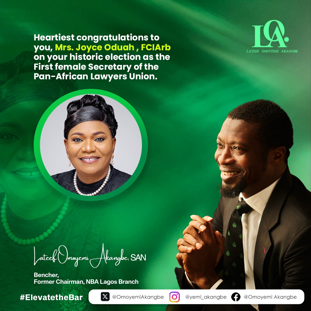 Heartiest congratulations to you, Mrs. Joyce Oduah, FCIArb on your historic election as the First female Secretary of the Pan-African Lawyers Union.