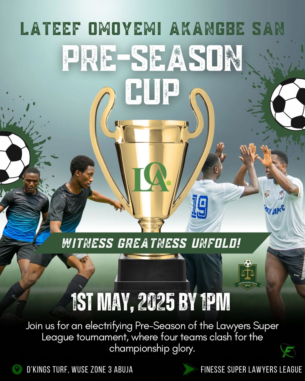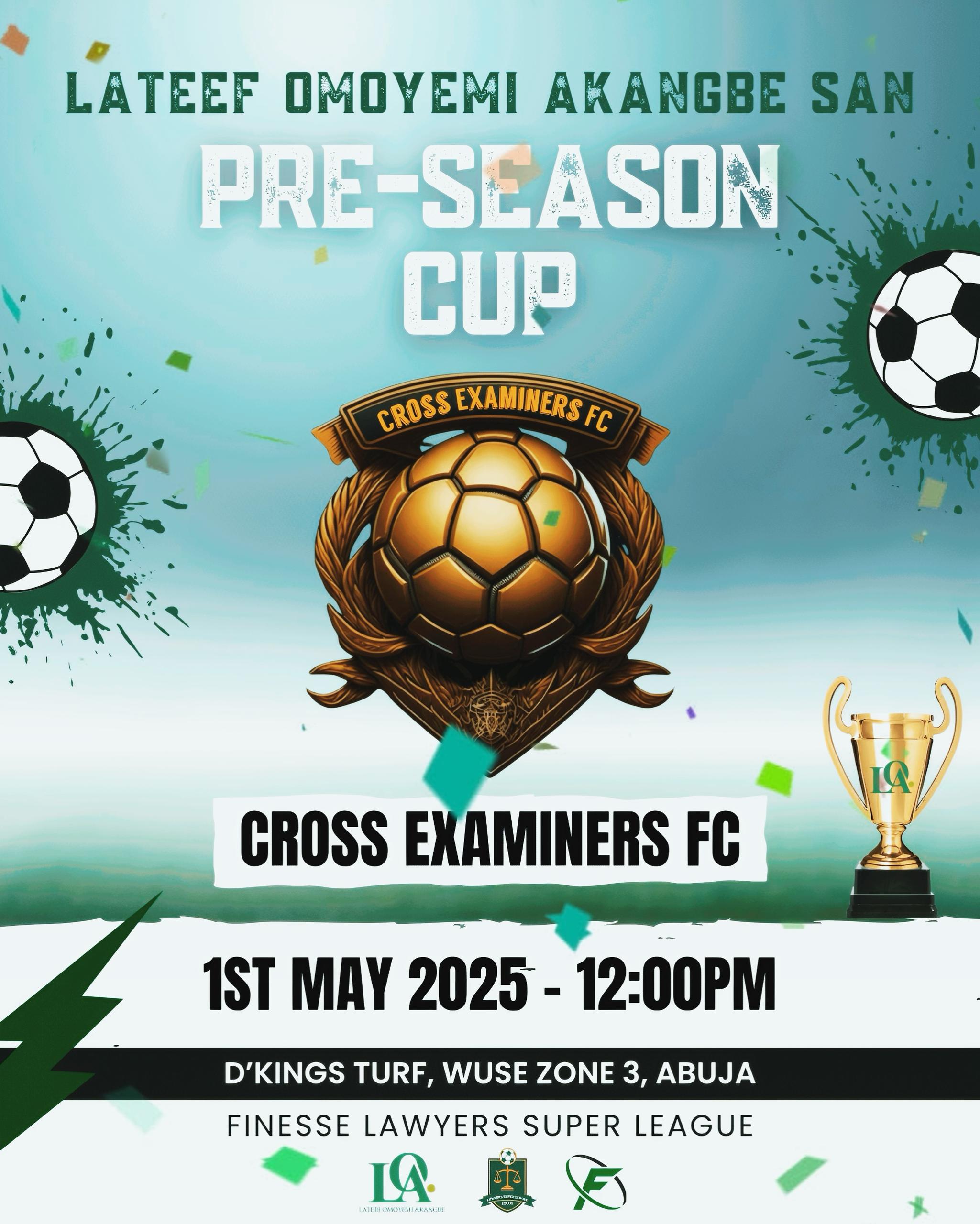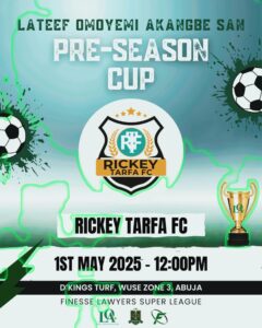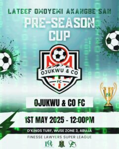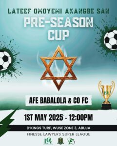 Get ready for high-stakes moves, power plays, and a whole lot of finesse as the Lateef Omoyemi Akangbe SAN Pre-Season Cup hits the turf this Wednesday, May 1st, 2025 at D’Kings Turf, Wuse Zone 3, Abuja!