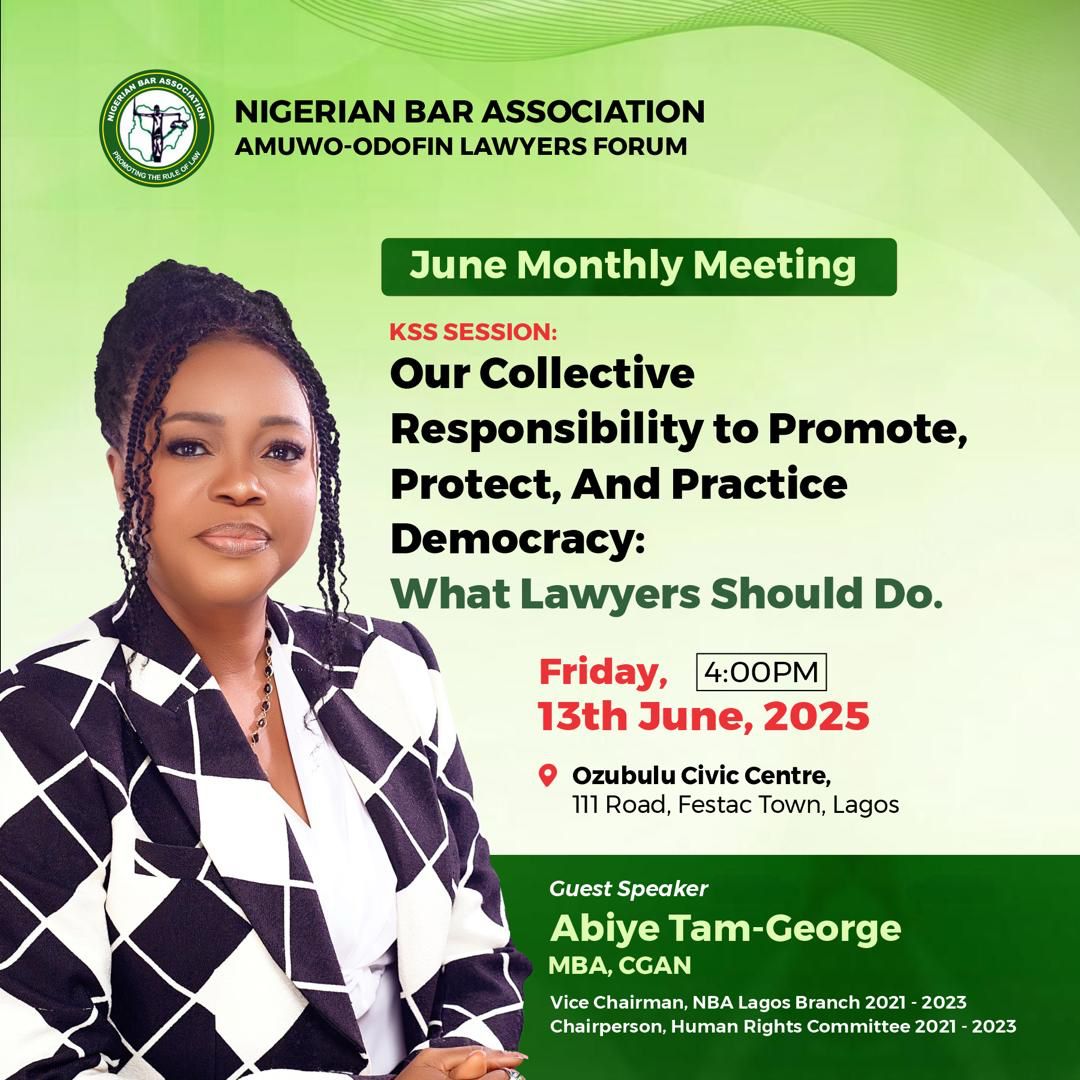 The Amuwo Odofin Lawyers Forum is set to hold its June 2025 meeting with a timely and thought-provoking session featuring legal practitioner and civic advocate, Abiye Tam-George, as the keynote speaker. Scheduled to address the theme “The Role of Lawyers in Defending Democracy,” the event aims to engage members of the legal profession in critical discourse around their responsibilities in safeguarding Nigeria’s democratic institutions.