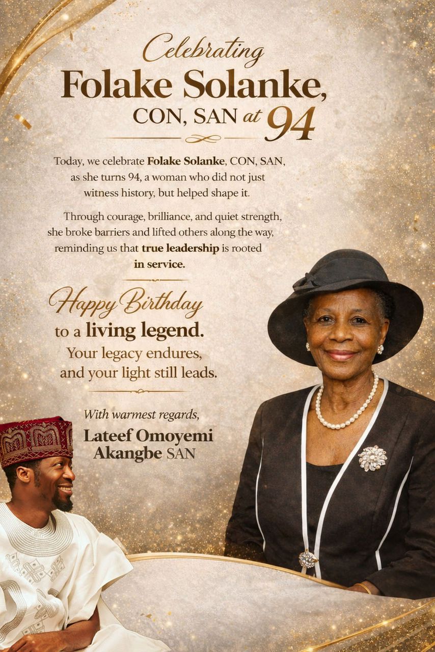 Senior Advocate of Nigeria, Lateef Omoyemi Akangbe, SAN, has paid glowing tribute to Chief Mrs. Folake Solanke, CON, SAN, as she marks her 94th birthday, describing her as a trailblazer whose impact on Nigeria’s legal profession remains indelible. In a heartfelt goodwill message titled “Breaking Barriers, Building Legacy,” Akangbe celebrated the nonagenarian as a symbol of courage, excellence, and resilience, noting that her historic emergence as the first female Senior Advocate of Nigeria paved the way for greater inclusion and progress within the Bar.