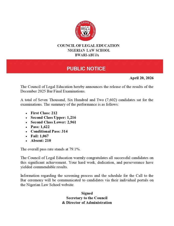 The Council of Legal Education has officially announced the release of the results of the December 2025 Bar Final Examinations conducted by the Nigerian Law School. According to a public notice issued on April 20, 2026, a total of 7,602 candidates sat for the examinations, marking another significant milestone in the nation’s legal education calendar. The Council provided a detailed breakdown of candidates’ performance across various grade classifications.