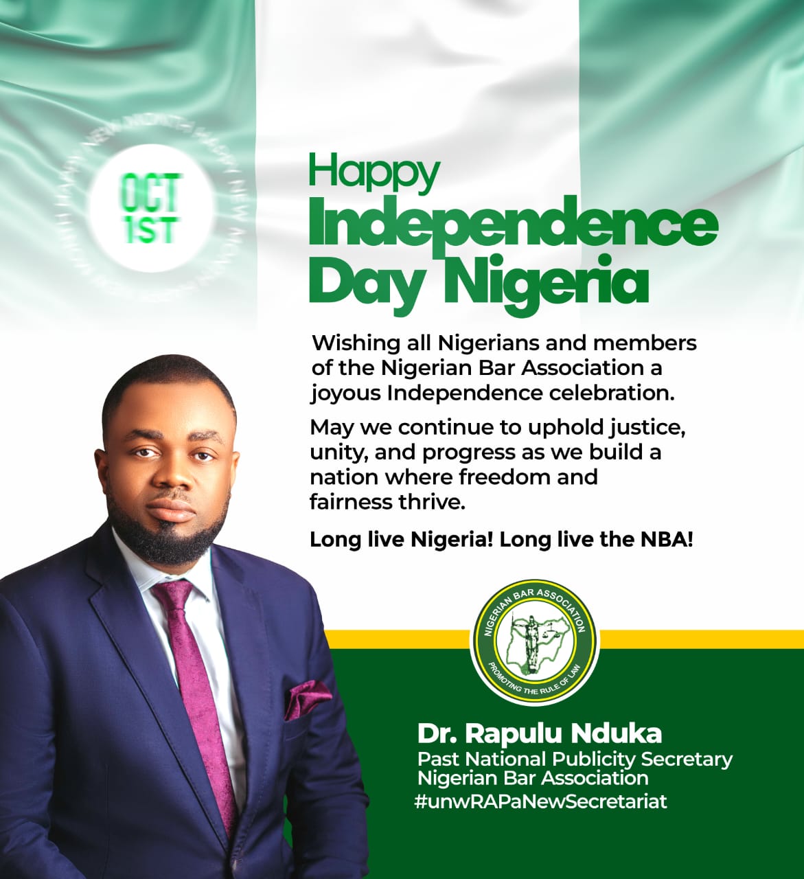 As the nation marked its Independence Day celebrations, Dr. Rapulu Nduka, Past National Publicity Secretary of the Nigerian Bar Association (NBA), extended warm felicitations to Nigerians both at home and in the diaspora. In his goodwill message, he congratulated citizens and members of the NBA for their resilience and commitment to the ideals of nationhood despite prevailing challenges.
