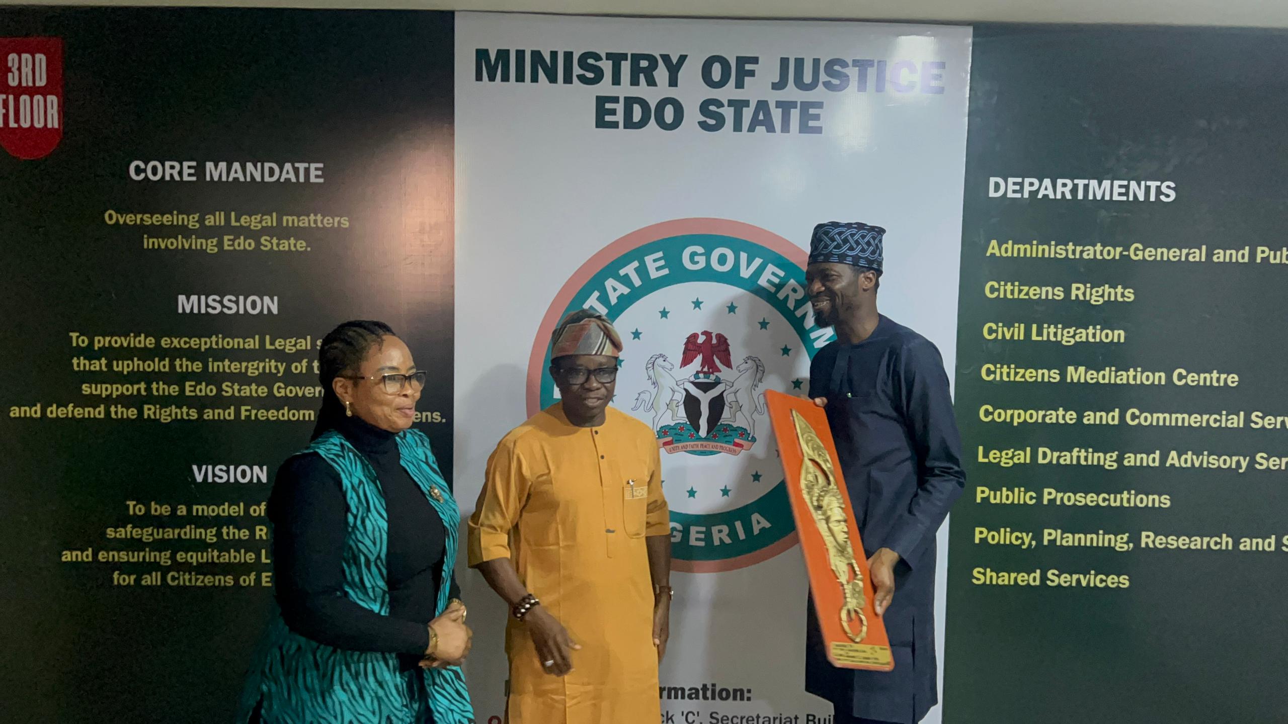 A highlight of the visit was the presentation of a gift to Mr Akangbe by Dr Osagie on behalf of the management and staff of the Ministry of Justice. Clementina AgwedaPublic Relations Officer, Office of the Attorney General and Commissioner for Justice, Edo State.