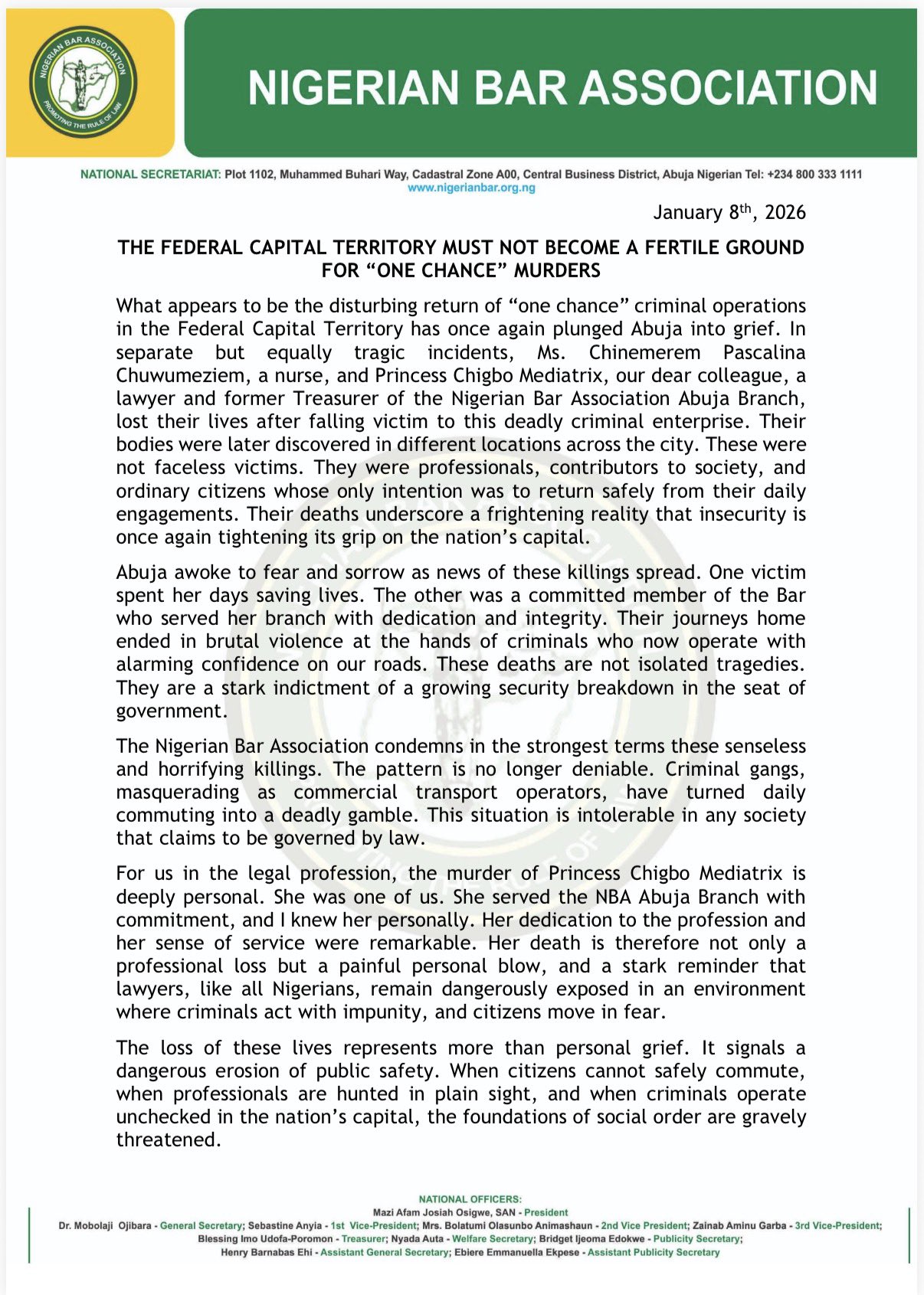 “What appears to be the disturbing return of “one chance” criminal operations in the Federal Capital Territory has once again plunged Abuja into grief. In separate but equally tragic incidents, Ms. Chinemerem Pascalina Chuwumeziem, a nurse, and Princess Chigbo Mediatrix, our dear colleague, a lawyer and former Treasurer of the Nigerian Bar Association Abuja Branch, lost their lives after falling victim to this deadly criminal enterprise. Their bodies were later discovered in different locations across the city. These were not faceless victims. They were professionals, contributors to society, and ordinary citizens whose only intention was to return safely from their daily engagements. Their deaths underscore a frightening reality that insecurity is once again tightening its grip on the nation’s capital.