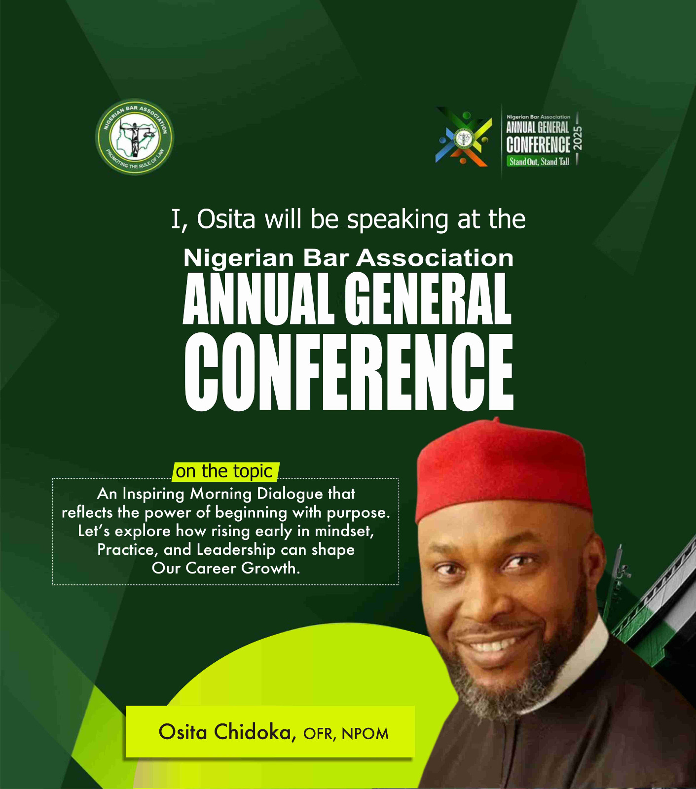 Delegates at the upcoming Nigerian Bar Association (NBA) Annual General Conference are set to experience an invigorating session as Osita Chidoka, OFR, NPOM, takes the stage to deliver an inspiring morning dialogue on the topic, “An Inspiring Morning Dialogue that Reflects the Power of Beginning with Purpose: Let’s Explore How Rising Early in Mindset, Practice, and Leadership Can Shape Our Career Growth”. His address will form part of the conference’s central theme, Stand Out, Stand Tall.