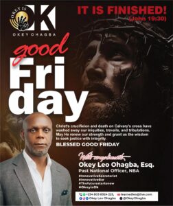 Legal practitioner and former national officer of the Nigerian Bar Association, Okey Leo Ohagba, Esq., has called on members of the legal profession and Christians nationwide to reflect deeply on the values of sacrifice, love, and redemption as they mark Good Friday 2026. In a solemn message, he emphasized the significance of Christ’s crucifixion as a powerful symbol of obedience, selflessness, and unwavering commitment to a higher purpose.