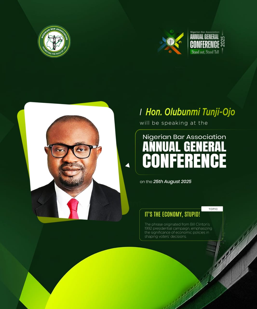 The Nigerian Bar Association (NBA) has confirmed that Hon. Olubunmi Tunji-Ojo, Minister of Interior and reform-minded public servant, will feature as a speaker at the Opening Plenary Session of the NBA Annual General Conference, taking place on Monday, August 25, 2025. The session, titled “It’s the Economy, Stupid”, will anchor on the conference’s overarching theme, “Stand Out, Stand Tall.” Tunji-Ojo is expected to bring a unique perspective on how economic stability directly influences national security, governance, and institutional integrity.
