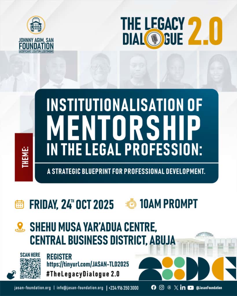 The Johnny Agim, SAN Foundation [JASAN Foundation] is pleased to announce the convergence of #TheLegacyDialogue 2.0, the second edition of JASAN Foundation’s annual flagship strategic think-tank to drive legal and judicial reform and advocacy in Nigeria.