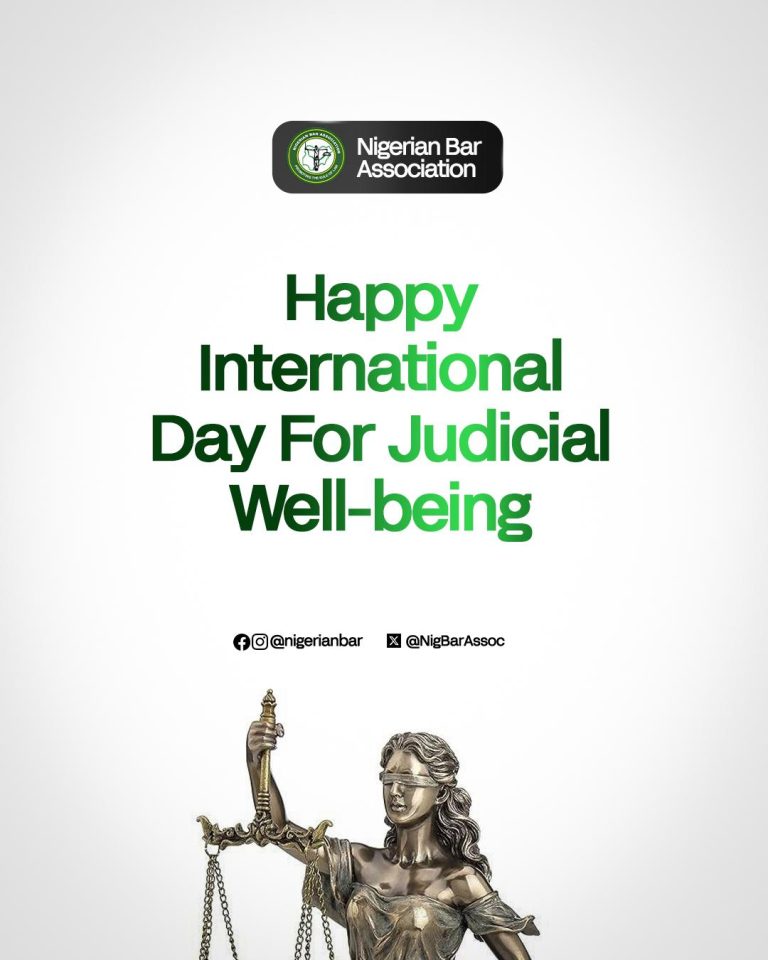 Today, the Nigerian Bar Association joins the global legal community in commemorating the International Day for Judicial Well-being, recently adopted by the United Nations General Assembly through Resolution A/79/L.52 and inspired by the historic Nauru Declaration on Judicial Well-being of 25 July 2024.