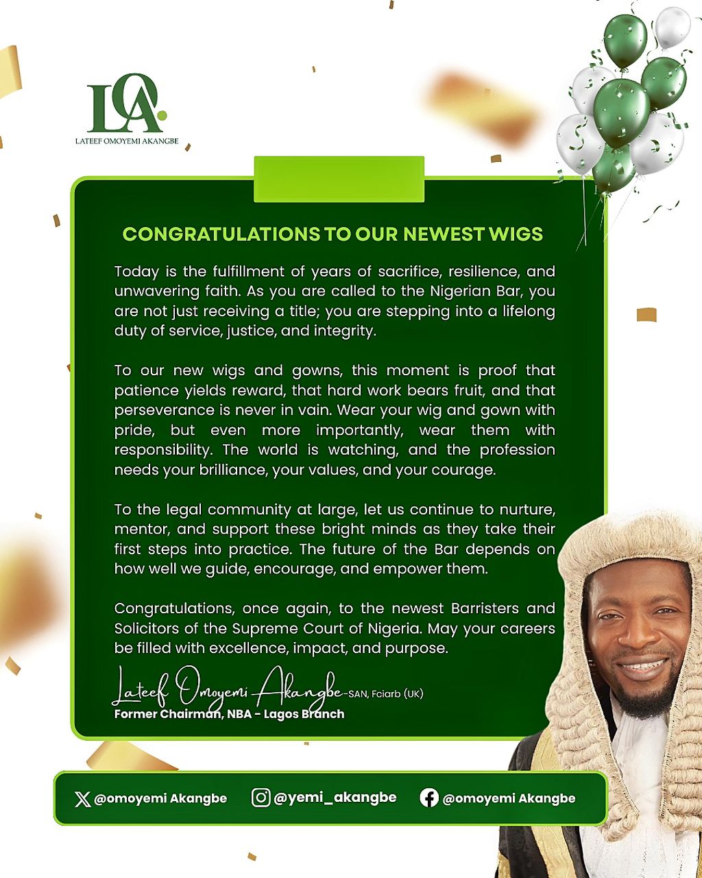 Lateef Omoyemi Akangbe, SAN, FCIArb(UK), former Chairman of the Nigerian Bar Association (NBA) Lagos Branch, has extended warm felicitations to the newly admitted lawyers called to the Nigerian Bar. In his goodwill message, Akangbe described the Call to Bar as not only a personal milestone but also the assumption of a sacred trust, urging the new wigs to see themselves as “servants of truth and stewards of equity.”
