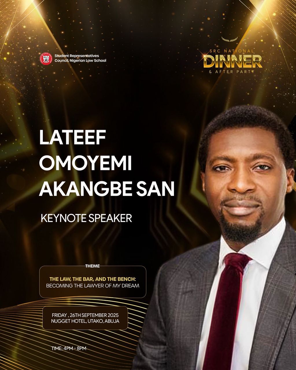 The Students’ Representative Council (SRC) has announced that Lateef Omoyemi Akangbe, SAN, will headline its upcoming National Dinner & After Party as the keynote speaker. Scheduled to hold on Friday, September 26, 2025, at Nugget Hotel, Utako, Abuja, the event promises to be an inspiring evening for young lawyers, students, and professionals across the legal spectrum.