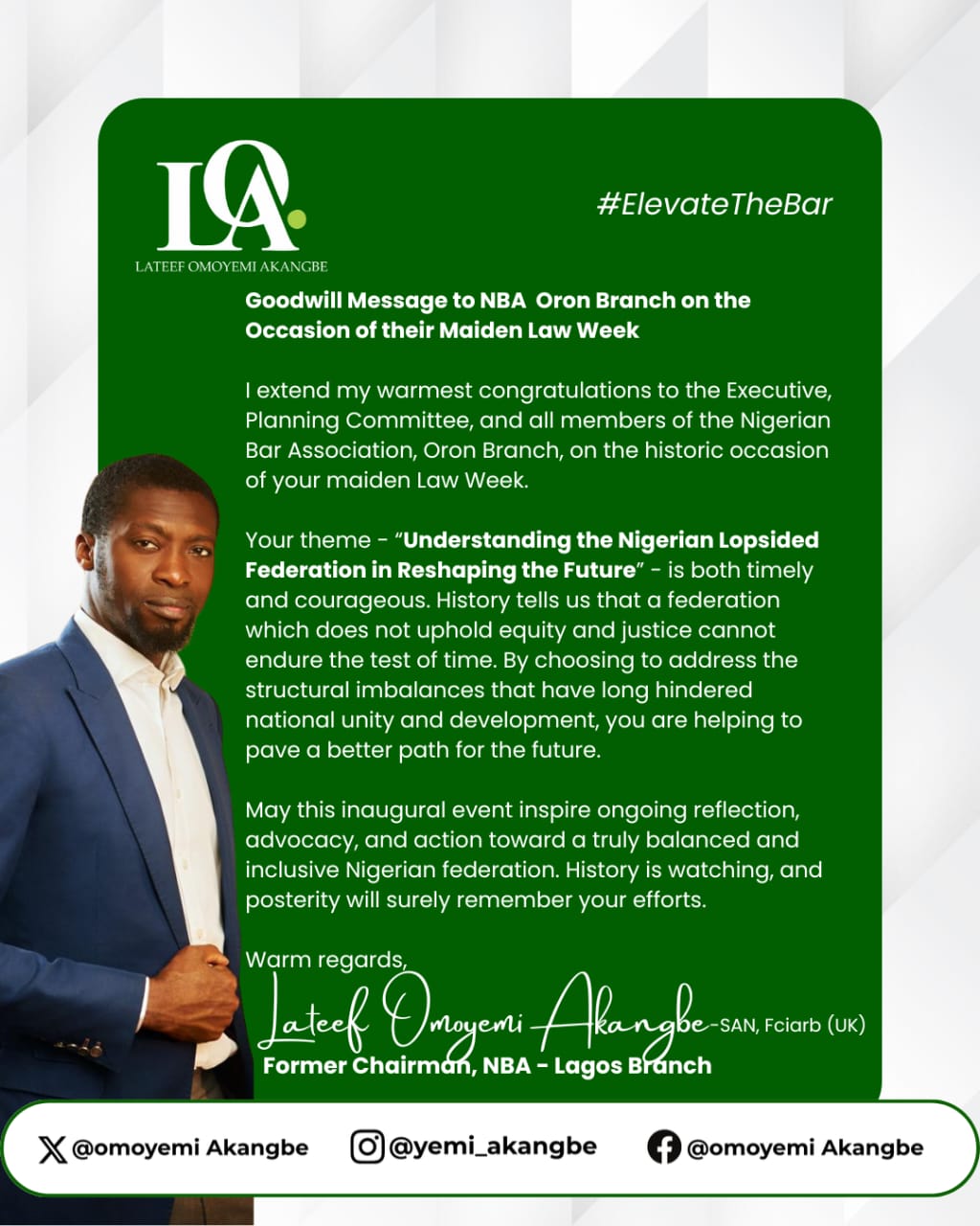 The Nigerian Bar Association (NBA), Oron Branch, has marked a significant milestone with the celebration of its maiden Law Week. The event, themed “Understanding the Nigerian Lopsided Federation in Reshaping the Future,” drew commendations from across the legal community, including a goodwill message from renowned legal luminary, Lateef Omoyemi Akangbe SAN, FCIArb(UK), a former Chairman of the NBA Lagos Branch.