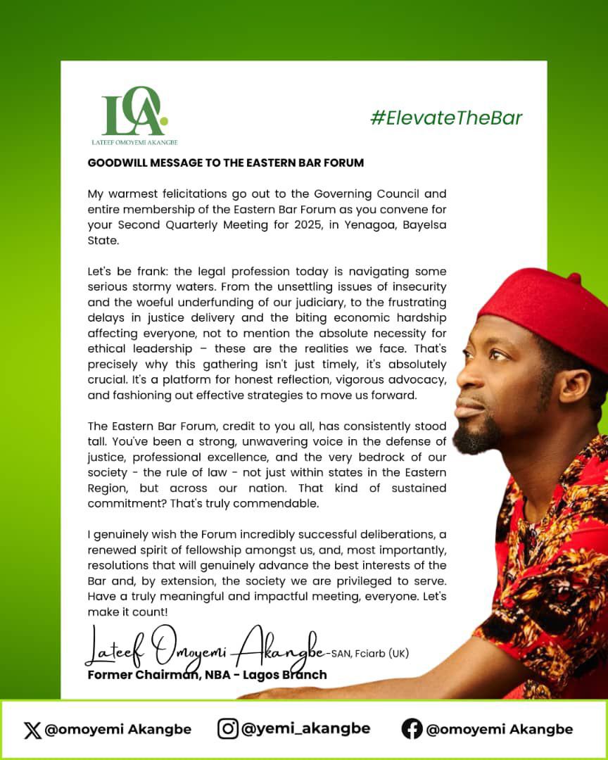 The Eastern Bar Forum (EBF) has been commended for its steadfast commitment to justice, professional excellence, and the defence of the rule of law as it convenes its Second Quarterly Meeting for 2025 in Yenagoa, Bayelsa State. Former Chairman of the Nigerian Bar Association (NBA) Lagos Branch, Lateef Omoyemi Akangbe, SAN, in a goodwill message to the Forum, noted that the gathering comes at a critical time when the legal profession is grappling with pressing national challenges, including insecurity, underfunding of the judiciary, delays in justice delivery, economic hardship, and the urgent need for ethical leadership.