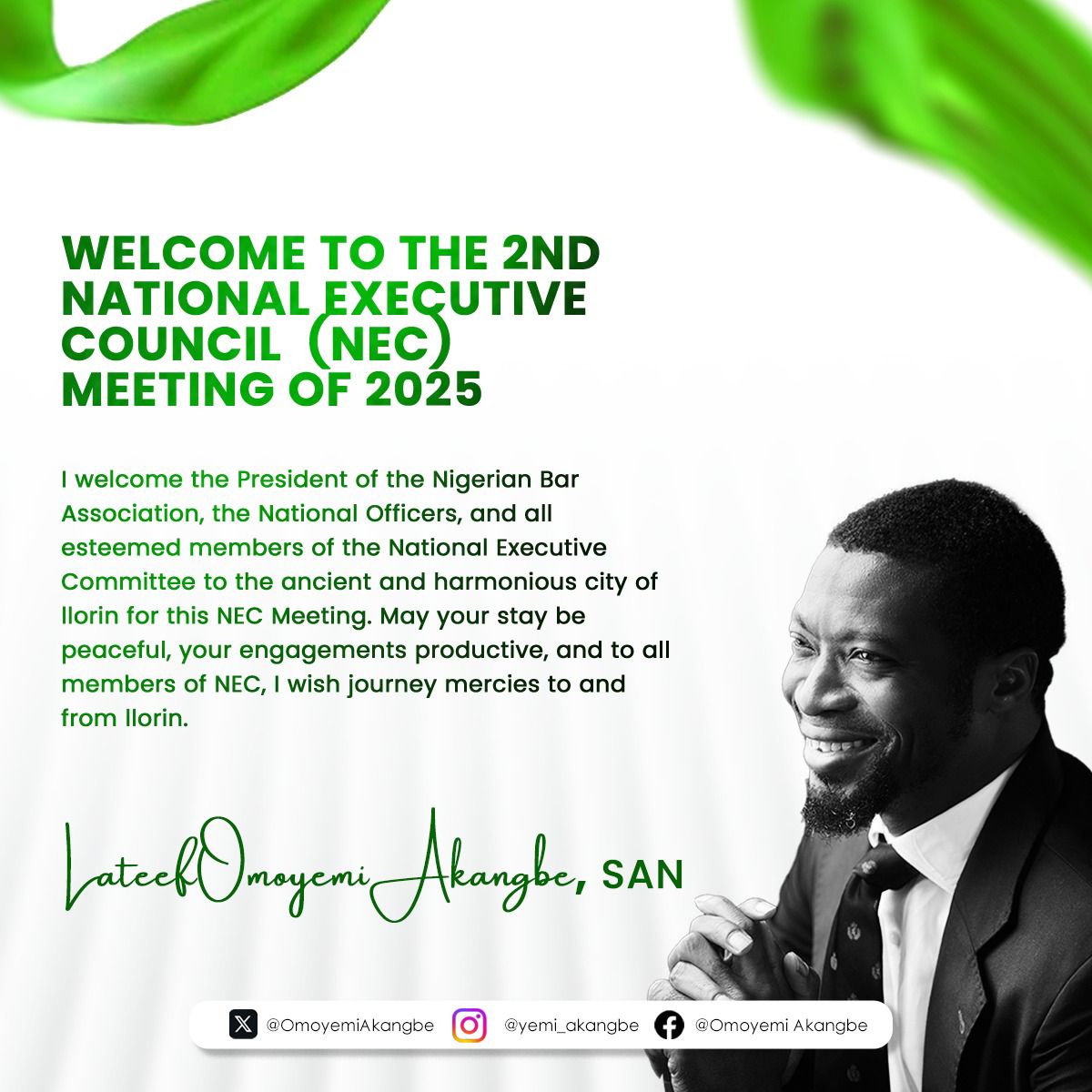 As the Nigerian Bar Association (NBA) National Executive Committee (NEC) meeting convenes in the historic city of Ilorin, Kwara State, esteemed Senior Advocate of Nigeria, Lateef Omoyemi Akangbe, SAN, extends a warm and distinguished welcome to all delegates. This important gathering of the legal community marks another milestone in the NBA’s ongoing efforts to strengthen the rule of law, uphold professional excellence, and foster unity among its members. Ilorin, known for its rich cultural heritage and tradition of hospitality, provides a fitting backdrop for deliberations that will shape the future of legal practice in Nigeria.