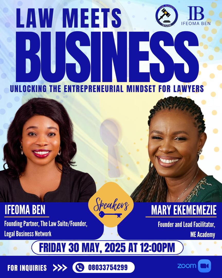 In a bid to empower legal professionals with business acumen, the Legal Business Network in collaboration with Ifeoma Ben is set to host a virtual session titled “Law Meets Business: Unlocking the Entrepreneurial Mindset for Lawyers.” The event will take place via Zoom on Friday, May 30, 2025, at 12:00 PM (West Central Africa Time).