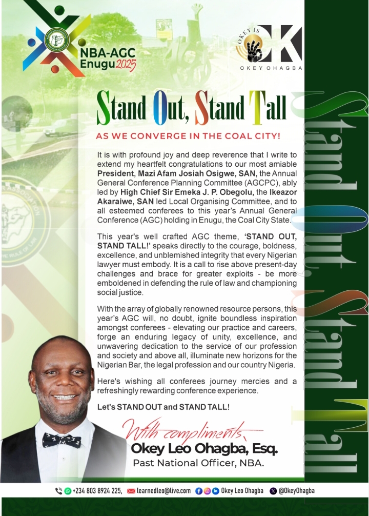 It is with profound joy and deep reverence that I write to extend my heartfelt congratulations to our most amiable President, Mazi Afam Josiah Osigwe, SAN , the Annual General Conference Planning Committee (AGCPC), ably led by High Chief Sir Emeka J. P. Obegolu, the Ikeazor Akaraiwe, SAN led Local Organising Committee, and to all esteemed conferees to this year’s Annual General Conference (AGC) holding in Enugu, the Coal City State.