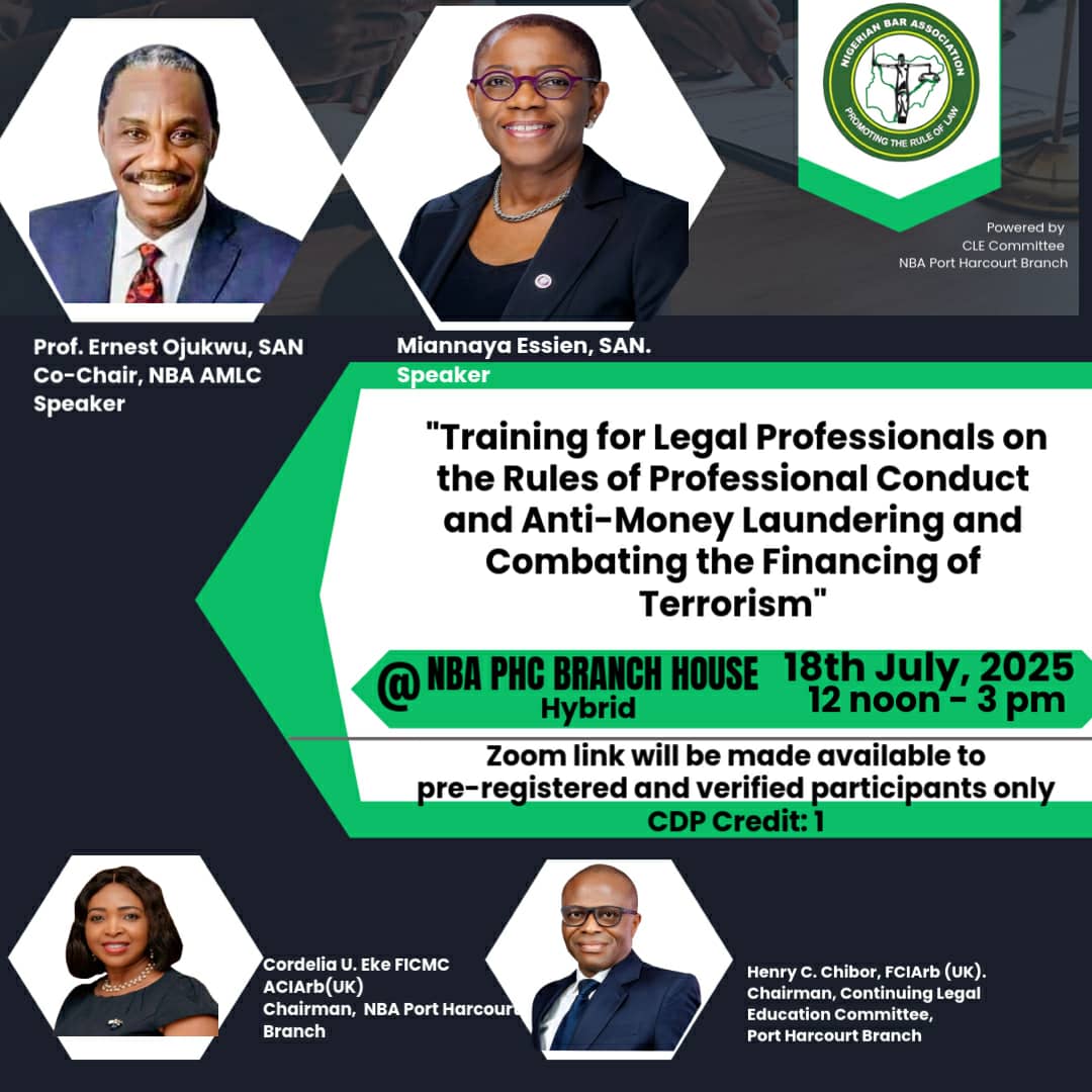 In a significant move to strengthen legal ethics and compliance, the Nigerian Bar Association (NBA) Port Harcourt Branch will on Friday, 18 July 2025, hold a special training for legal professionals focused on the Rules of Professional Conduct (RPC) and Anti-Money Laundering and Combating the Financing of Terrorism (AML/CFT). The event is scheduled to take place at the NBA House in Port Harcourt and will be held in a hybrid format to accommodate both physical and virtual participants.