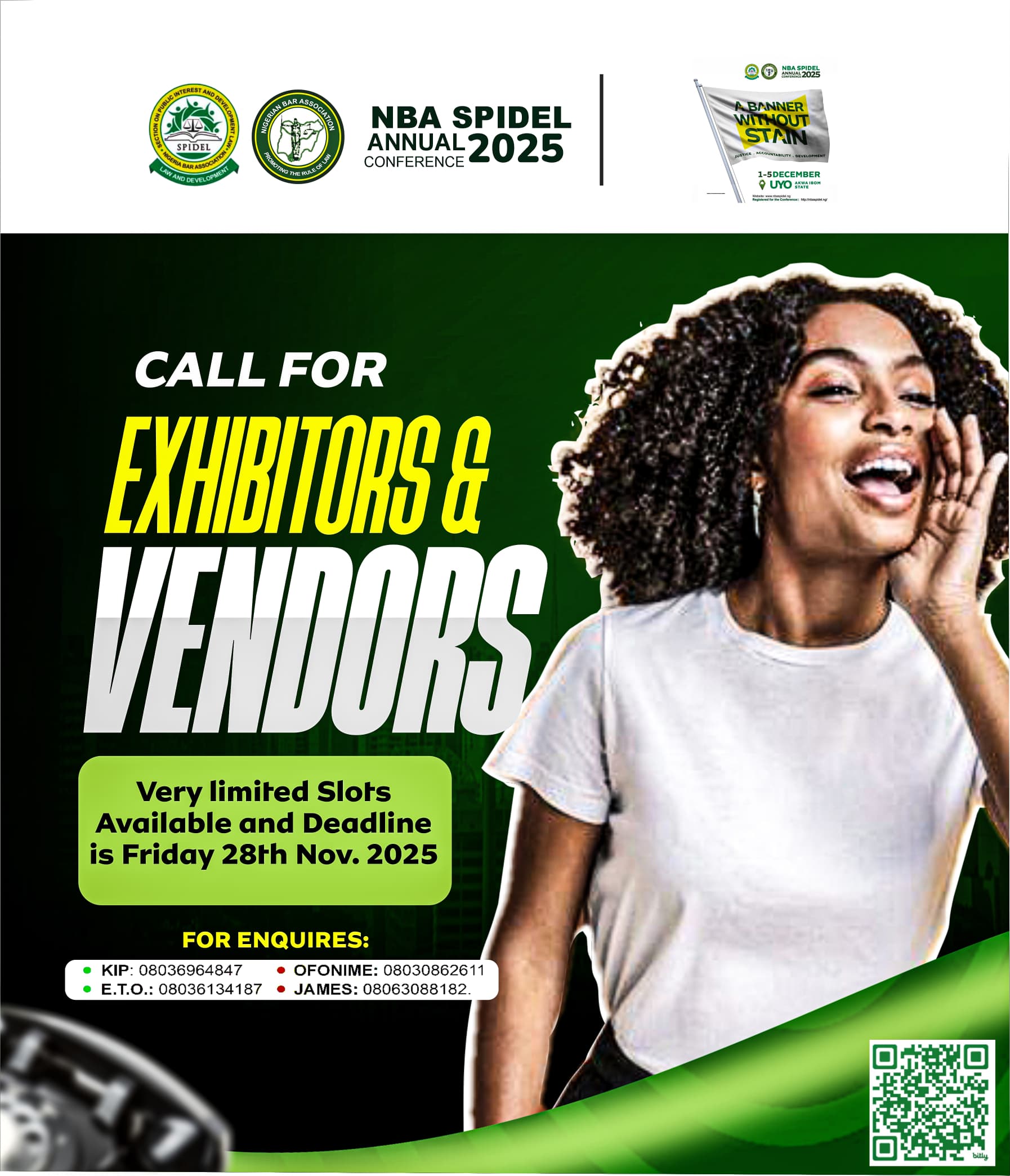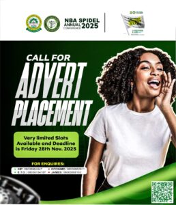 Don’t miss this opportunity to position your brand at the heart of the NBA-SPIDEL 2025 Conference. With sundry participants and online visibility, your advert will reach decision-makers, professionals, influencers and stakeholders across Nigeria and beyond.