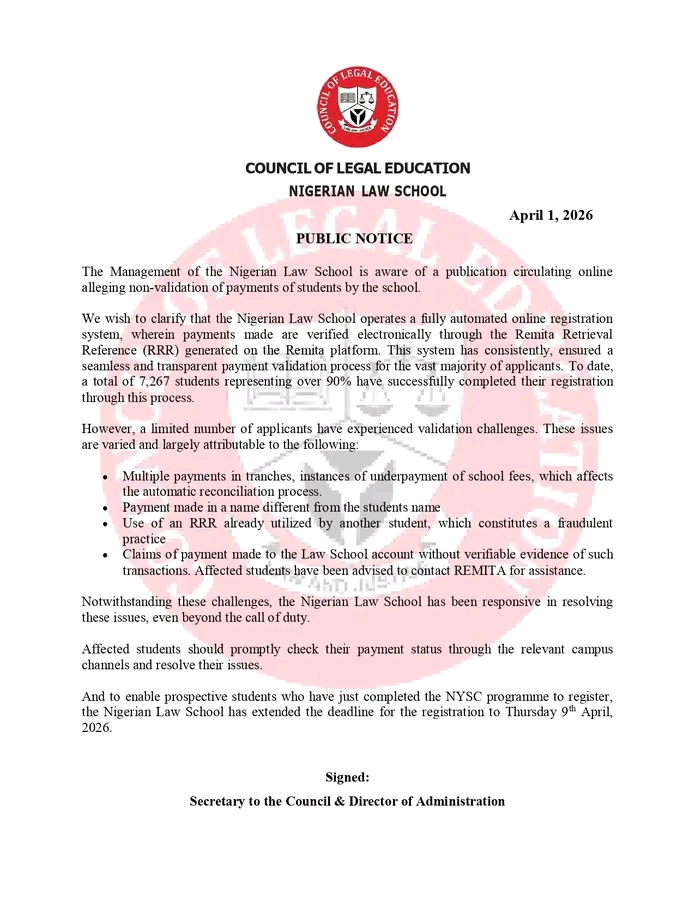 The Nigerian Law School has issued a public notice addressing concerns over alleged non-validation of student payments, assuring stakeholders that its registration and payment systems remain reliable and transparent. In the statement released by the Council of Legal Education on April 1, 2026, the institution dismissed circulating claims online, emphasizing that its automated system continues to effectively verify payments for the vast majority of students.