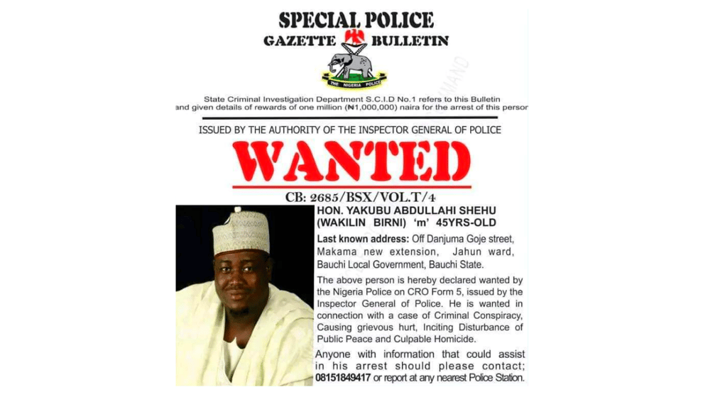 According to the bulletin, the order for his arrest was given by the Inspector-General of Police, IGP Usman Alkali Baba.
