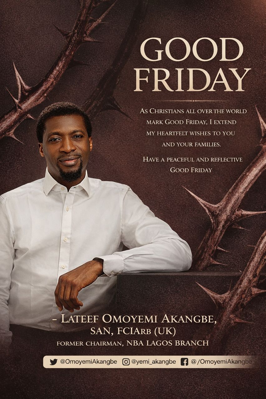 A former Chairman of the Nigerian Bar Association (NBA), Lagos Branch, Lateef Omoyemi Akangbe, SAN, has called on legal practitioners across the country to reflect deeply on the significance of Good Friday, urging a renewed commitment to the ideals of justice, service, and professional integrity. In his Good Friday message, Akangbe joined Christians in Nigeria and around the world in commemorating the solemn occasion, highlighting its enduring lessons of sacrifice, love, and redemption.