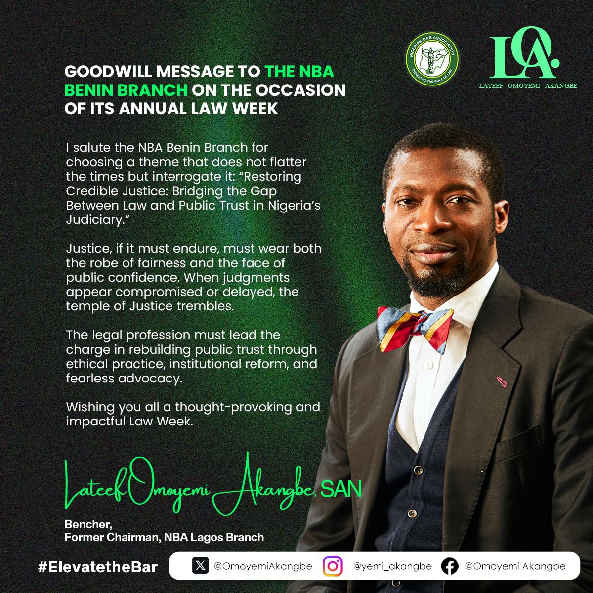 Legal luminary and Senior Advocate of Nigeria, Lateef Omoyemi Akangbe, has called on members of the Nigerian Bar Association (NBA) to take the lead in restoring public trust in the country’s judicial system. Delivering a goodwill message to the NBA Benin Branch on the occasion of its 2025 Annual Law Week, Akangbe commended the Branch for selecting a theme that critically addresses the growing concerns over the credibility of justice delivery in Nigeria. The theme of the Law Week, “Restoring Credible Justice: Bridging the Gap Between Law and Public Trust in Nigeria’s Judiciary,” he noted, was both timely and necessary.