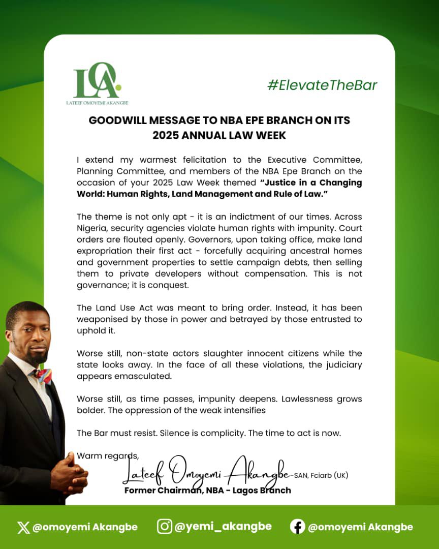 Lateef Omoyemi Akangbe, SAN, has delivered a powerful goodwill message to the Nigerian Bar Association, Epe Branch, on the occasion of its 2025 Annual Law Week. Commending the Branch for its courageous theme—“Justice in a Changing World: Human Rights, Land Management and Rule of Law”—Akangbe described it as not only relevant but also a sobering reflection of Nigeria’s current realities.