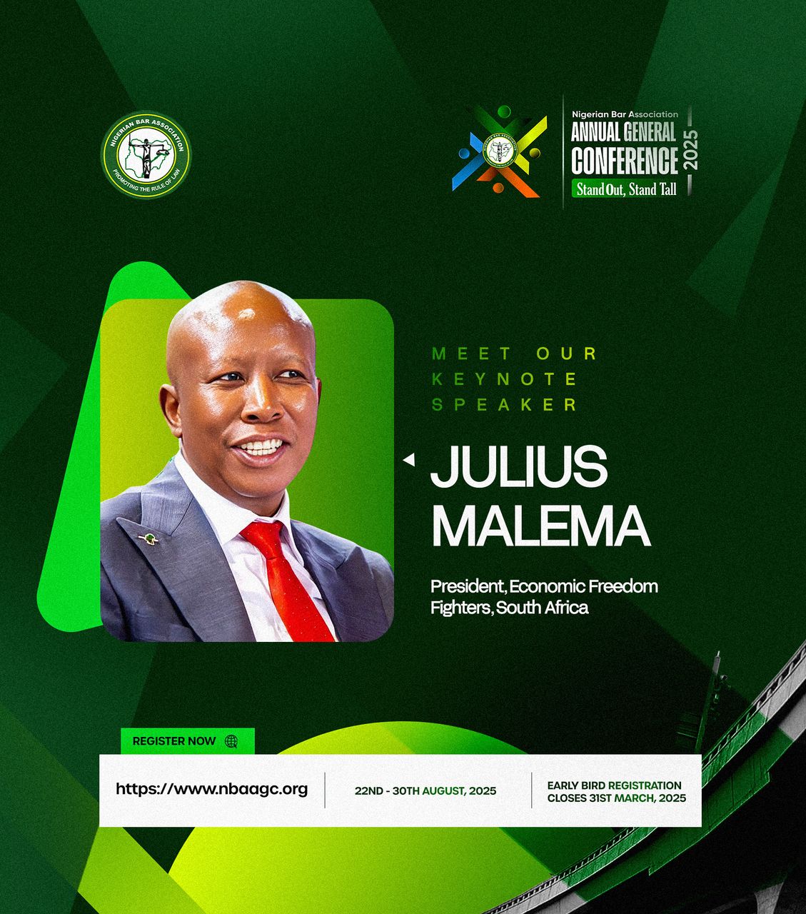 The 2025 Nigerian Bar Association (NBA) Annual General Conference is set to host one of Africa’s most dynamic political voices as Julius Malema, President of South Africa’s Economic Freedom Fighters (EFF), takes the stage as keynote speaker.