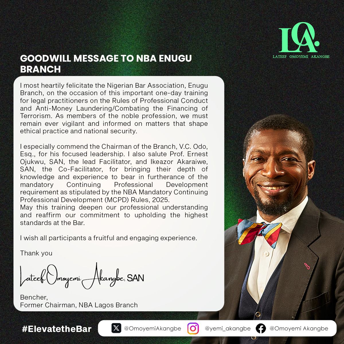 In a goodwill message delivered ahead of a key professional development event, Lateef Omoyemi Akangbe, SAN, FCIArb (UK), former Chairman of the NBA Lagos Branch, has commended the Nigerian Bar Association (NBA) Enugu Branch for organizing a pivotal one-day training on the Rules of Professional Conduct and Anti-Money Laundering/Combating the Financing of Terrorism (AML/CFT). The training brings together legal professionals to engage with pressing issues of ethics, compliance, and national security, reinforcing the Bar’s commitment to upholding integrity in legal practice.