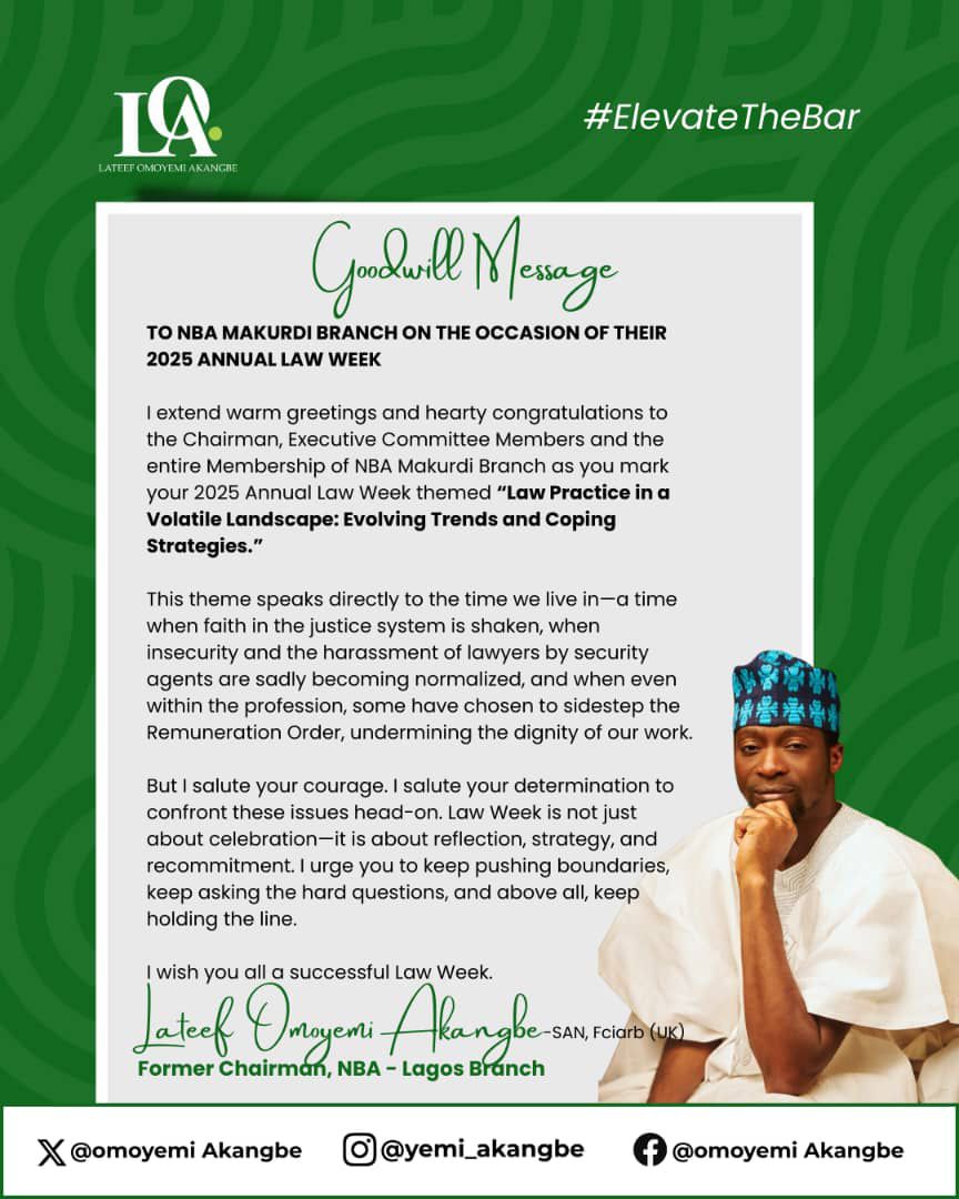 I extend warm greetings and hearty congratulations to the Chairman, Executive Committee Members and the entire Membership of NBA Makurdi Branch as you mark your 2025 Annual Law Week themed *“Law Practice in a Volatile Landscape: Evolving Trends and Coping Strategies.”*