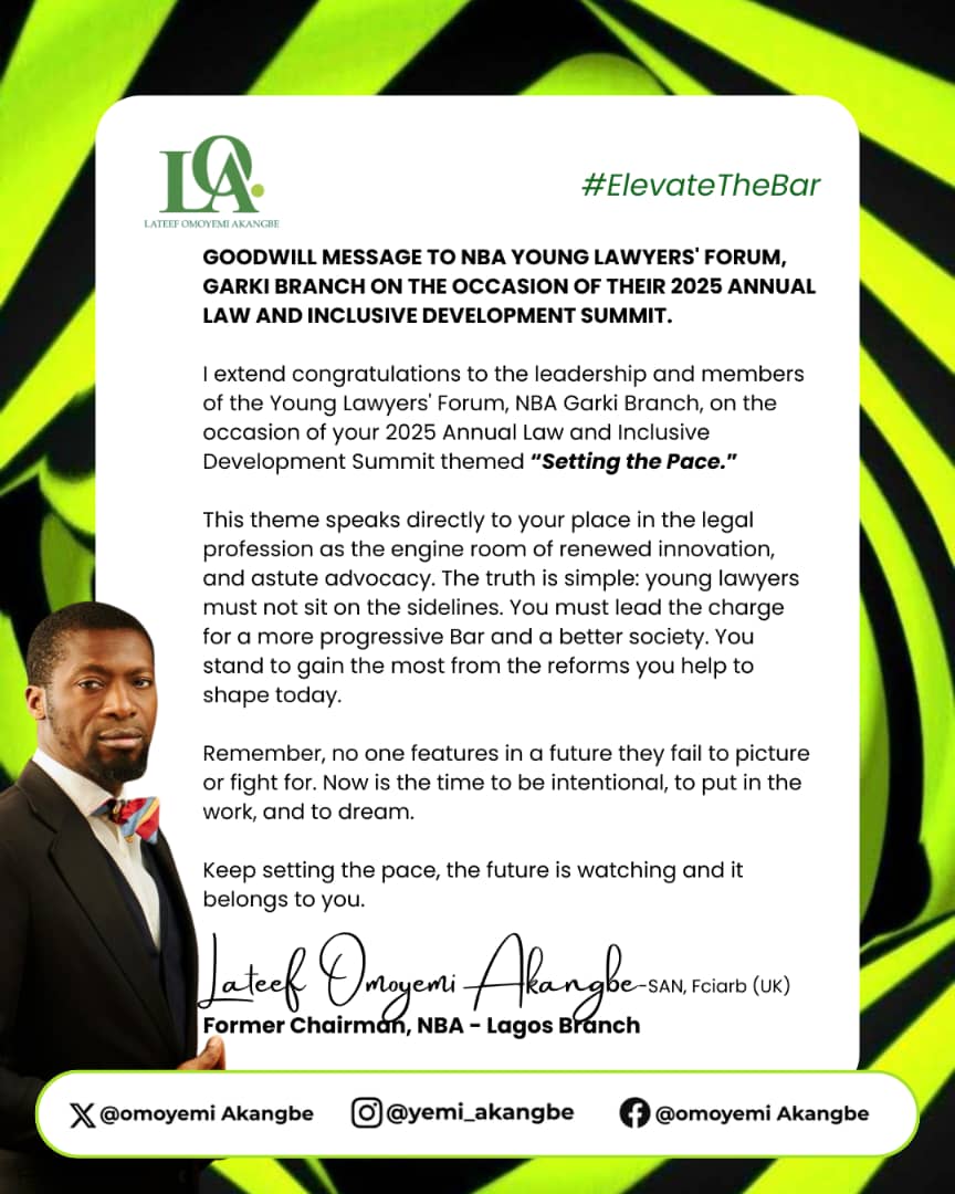 I extend congratulations to the leadership and members of the Young Lawyers’ Forum, NBA Garki Branch, on the occasion of your 2025 Annual Law and Inclusive Development Summit themed “Setting the Pace.”
