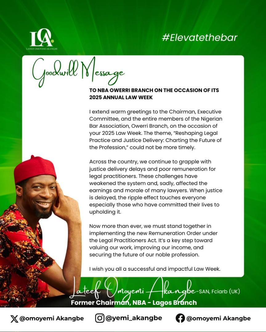 GOODWILL MESSAGE TO NBA OWERRI BRANCH ON THE OCCASION OF ITS 2025 ANNUAL LAW WEEK